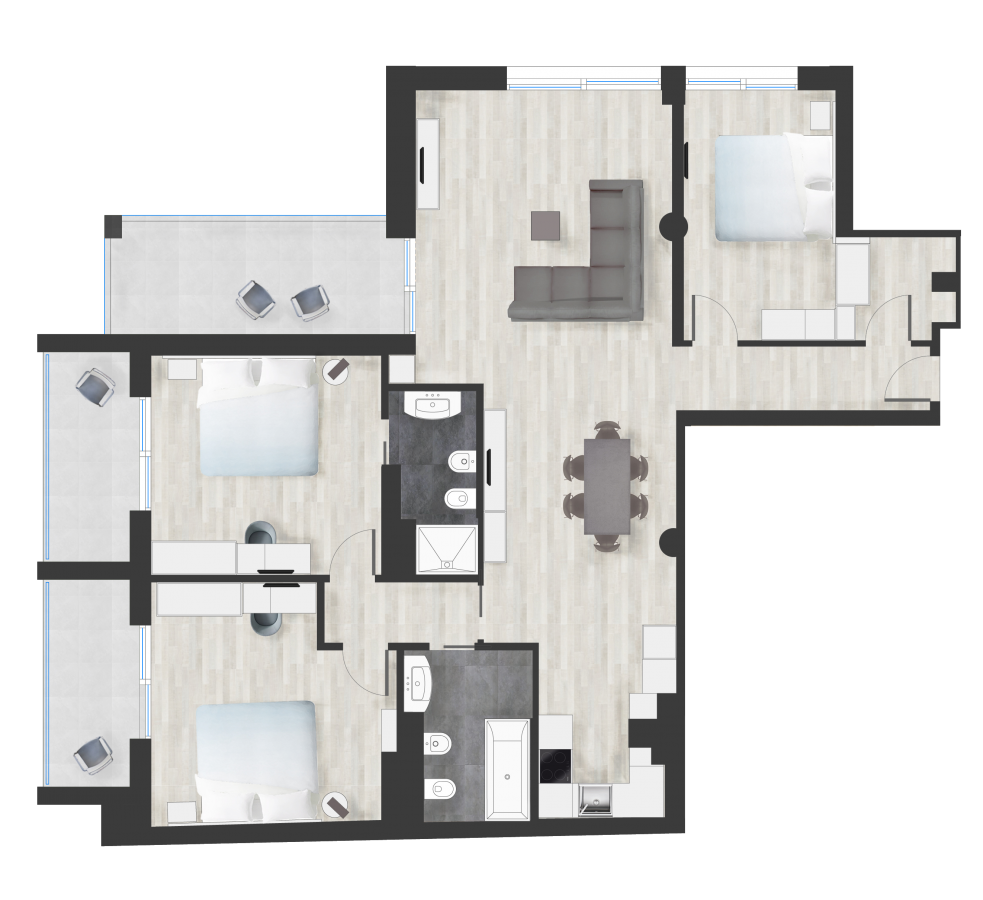 The apartment has three wide terraces.