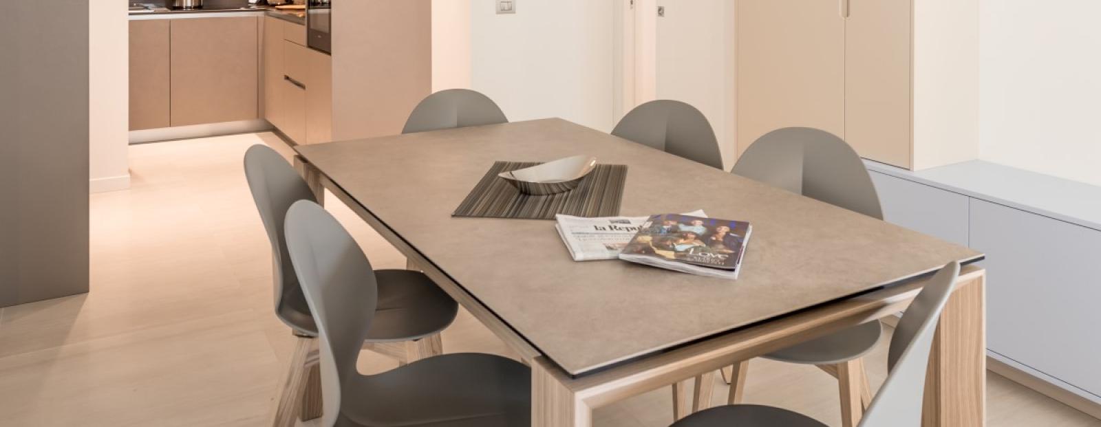 Owen and microwave SIEMENS, Induction burning SIEMENS, Washingmashine, Dishwasher SIEMENS, Clotheshorse, Fridge+ Freezer SIEMENS, Dishes Loves and Pentols, Detergents for appartments, hair dryer, digital safe deposit, Air-conditioning, Heating, Soundproofing, Energy-saving, Minibar, Private beach, Car-park in Via Monaco, Balcony with Solarium and swimmingpool,  LED lighting