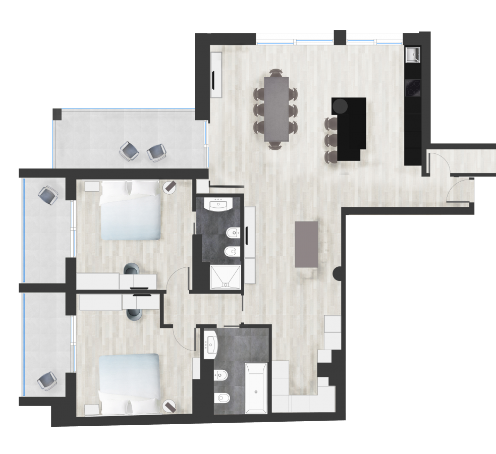 две спальни– 15+16кв.м., две ванные комнаты - 6+4кв.м.